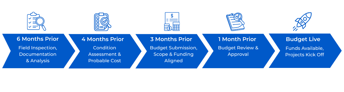 To help guide your planning, the timeline below shows how parking structure inspections, assessments, and budget decisions typically align with a healthcare facility’s annual budget cycle.